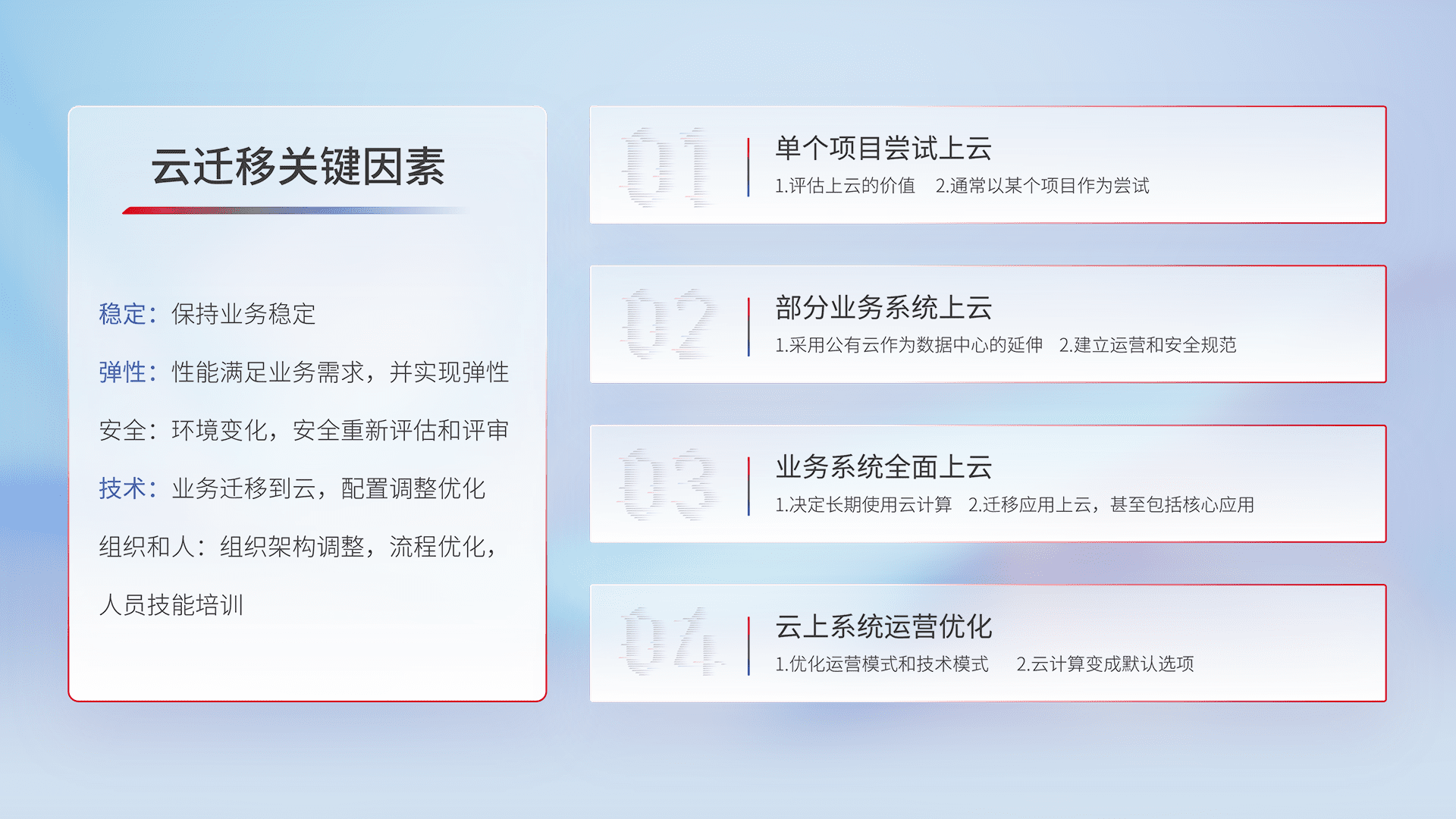 结合实际业务,,,,从规划设计、、云平台选型、、、、云原生改造、、、数据迁移、、、、集成交付,,,,迁移全过程为客户识别最佳上云路径,,,做好风险识别管理,,设计网络架构、、身份权限、、、、安全审计合规、、、、操作审计、、、、日志审计、、、、监控告警策略、、、多站点容灾设计等,,,对云上基础设施进行整体规划,,,,提升IT治理水平,,以满足弹性、、、、高可用、、、高性能的需求。。。